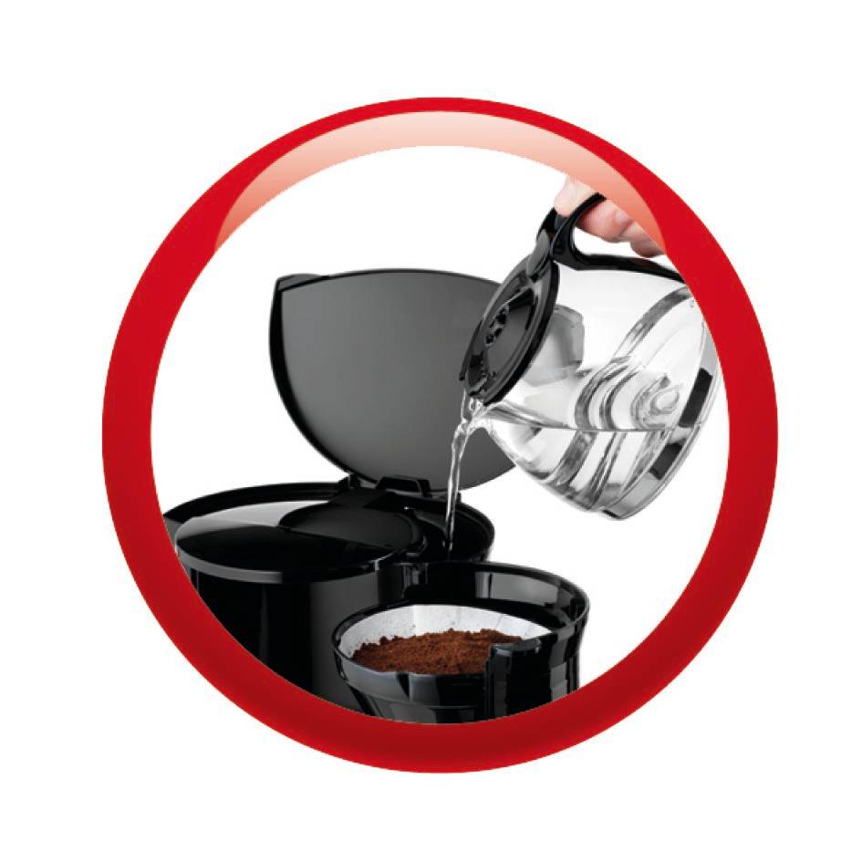 Facile accesso al serbatoio dell'acqua e al supporto filtro Facile pulizia e riempimento di caffè macinato grazie al supporto filtro amovibile Facile dosaggio e riempimento di acqua frontale con finestra trasparente per il controllo del livello dell'acqua