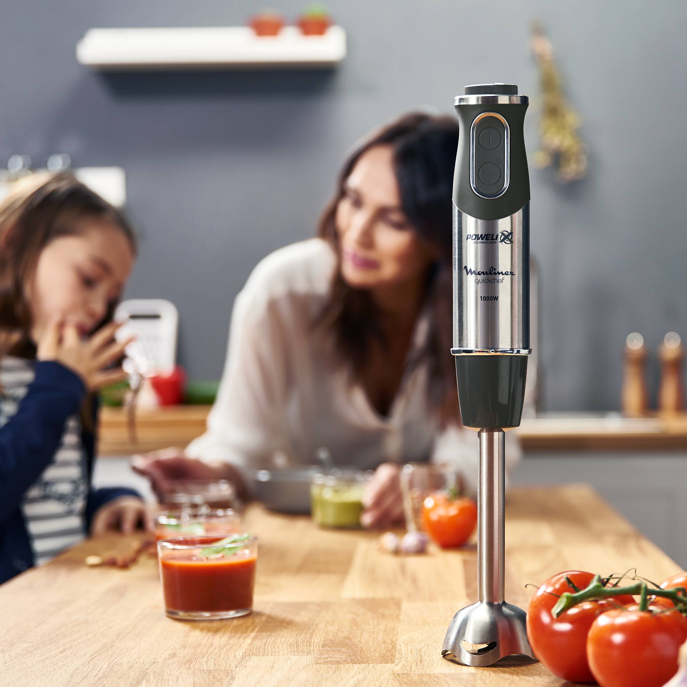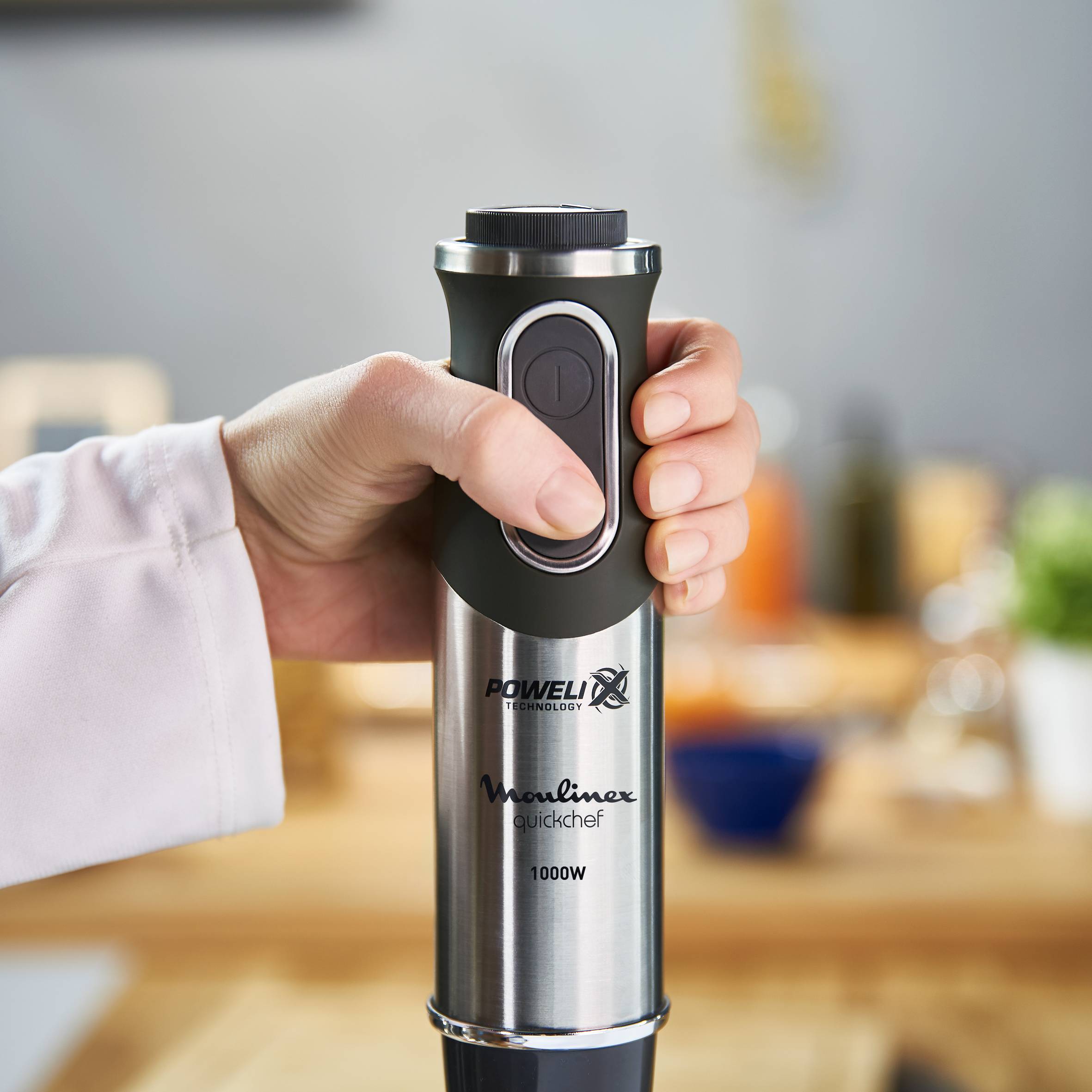 Potenza ottimale senza alcuna fatica! Con il frullatore ad immersione Quickchef di Moulinex, godi di alte prestazioni e controllo totale grazie alla Powelix Technology e alle sue lame combinate con il motore da 1000 W che amplificano la potenza raggiungendo risultati perfetti ogni volta. Questa tecnologia assicura una incredibile cremosità in poco tempo, anche con gli ingredienti più difficili! In più, le 10 velocità possono essere regolate senza arrestare la macchina mediante un quadro di comandi intuitivo e facile da usare. Il mixer beneficia anche di pratiche carattersitiche che include una protezione antischizzi, un'impugnatura antiscivolo per un maggiore comfort d'uso e le componenti lavabili in lavastoviglie per una facile pulizia. A completamento, vengono forniti un bicchiere da 800 ml, un tritatutto da 500 ml per sminuzzare facilmente vari ingredienti e una frusta per sbattere senza fatica.