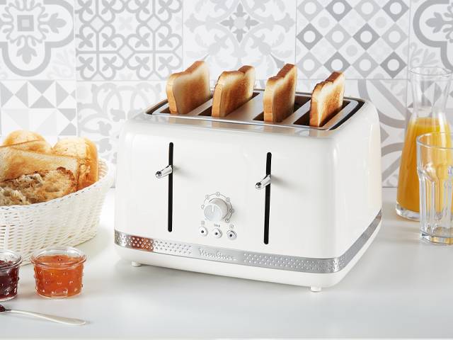Un elegante tostapane a 4 fette con un design innovativo, vivace e colorato 7 livelli di doratura per toast perfetti proprio come li vuoi tu Scomparti a larghezza variabile per risultati perfetti con fette di pane sottili o spesse Tasti luminosi versatili e intuitivi: Arresto/espulsione, scongelamento e riscaldamento Leva di sollevamento extra per rimuovere facilmente anche le fette di pane più piccole Vassoio raccoglibriciole amovibile per una pulizia senza sforzi