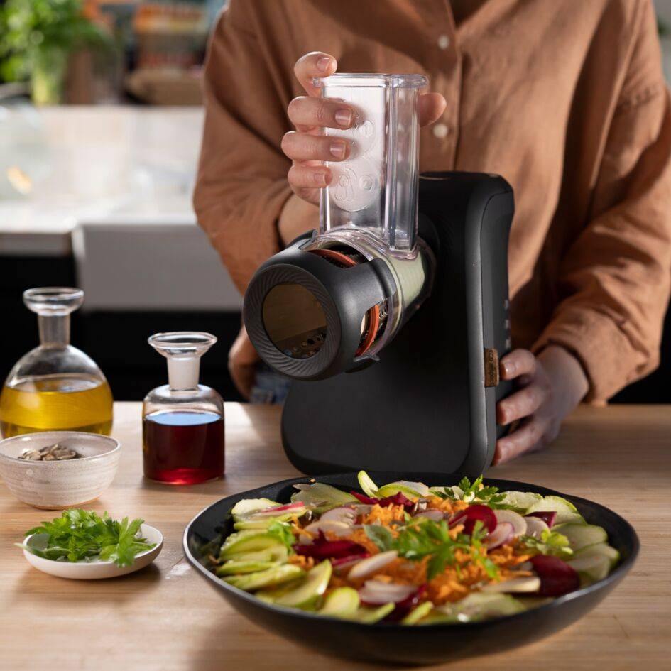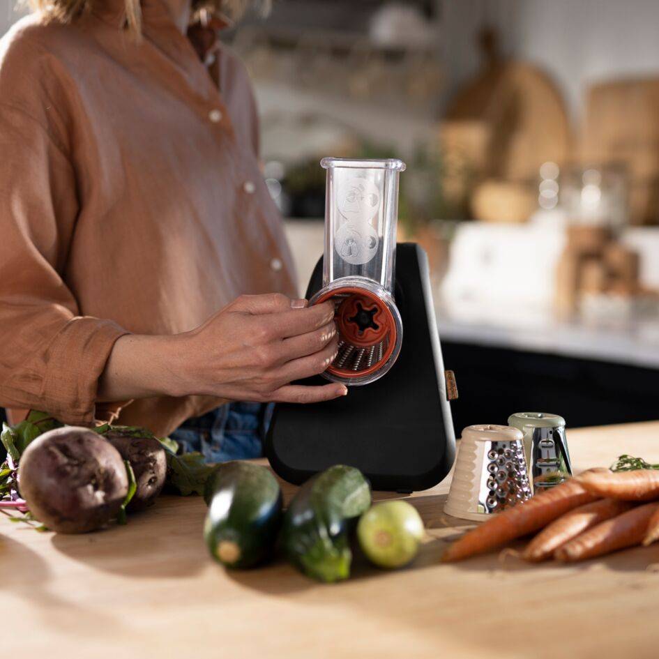 Preparare le verdure non è mai stato così facile grazie alla grattugia Eco Respect! Grazie al semplice sistema con coni colorati, la grattugia e affettatrice elettrica Fresh Express di Moulinex ti consente di preparare tutte le tue ricette a base di verdure con un unico apparecchio pratico. Grattugia, sminuzza e affetta alla perfezione, con risultati eccezionali per tutte le tue ricette e i tuoi ingredienti preferiti: verdure, frutta, cioccolato e molto altro— per preparare ricette come insalate fresche e deliziosamente sminuzzate, appetitose frittelle di verdure e latkes di patate croccanti e sempre perfette. Grazie all'ampio tubo di alimentazione, non è necessario tagliare troppo gli ingredienti prima di inserirli. Il design facile da pulire e da riporre completa l'offerta di questo prodotto. Questa grattugia dal design eco è il tocco finale perfetto per un apparecchio elegante e compatto che si adatta perfettamente a qualunque tipo di cucina.