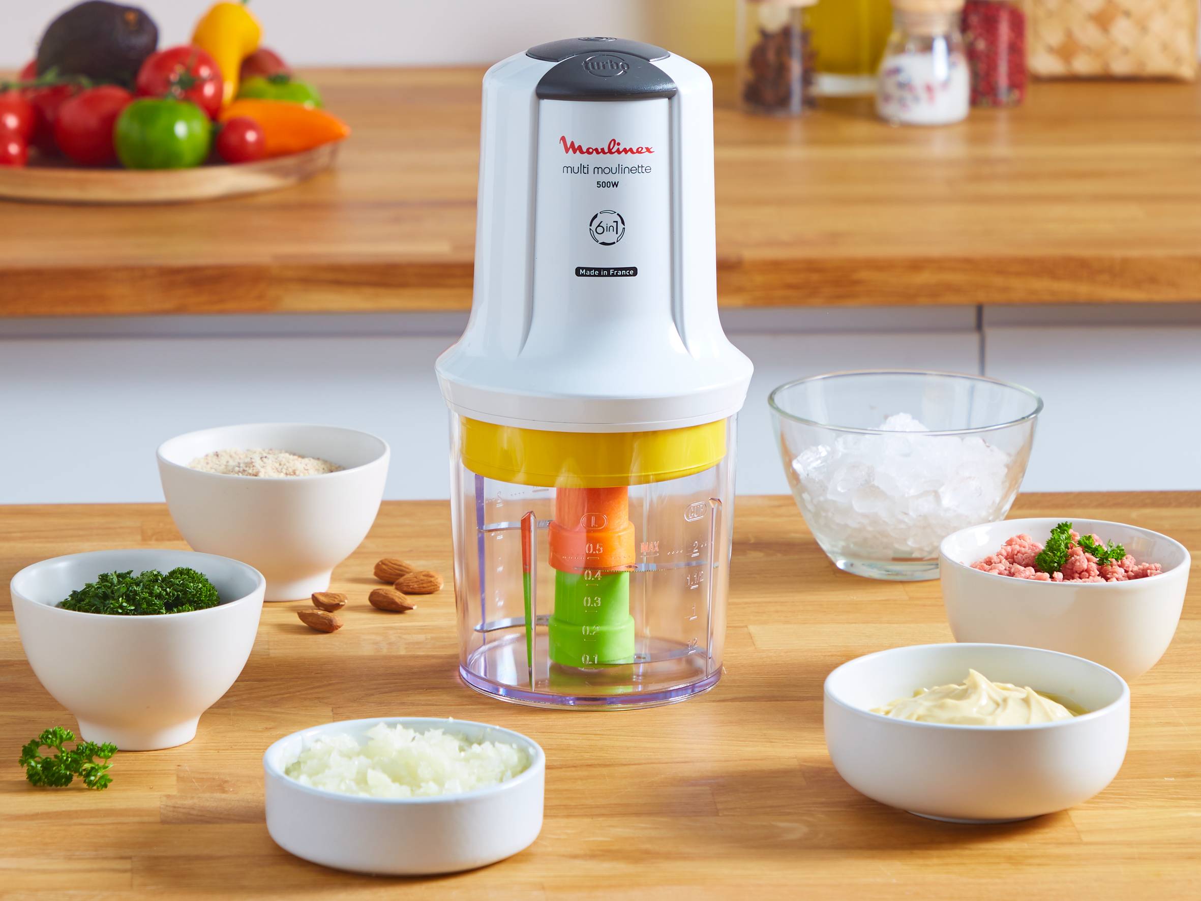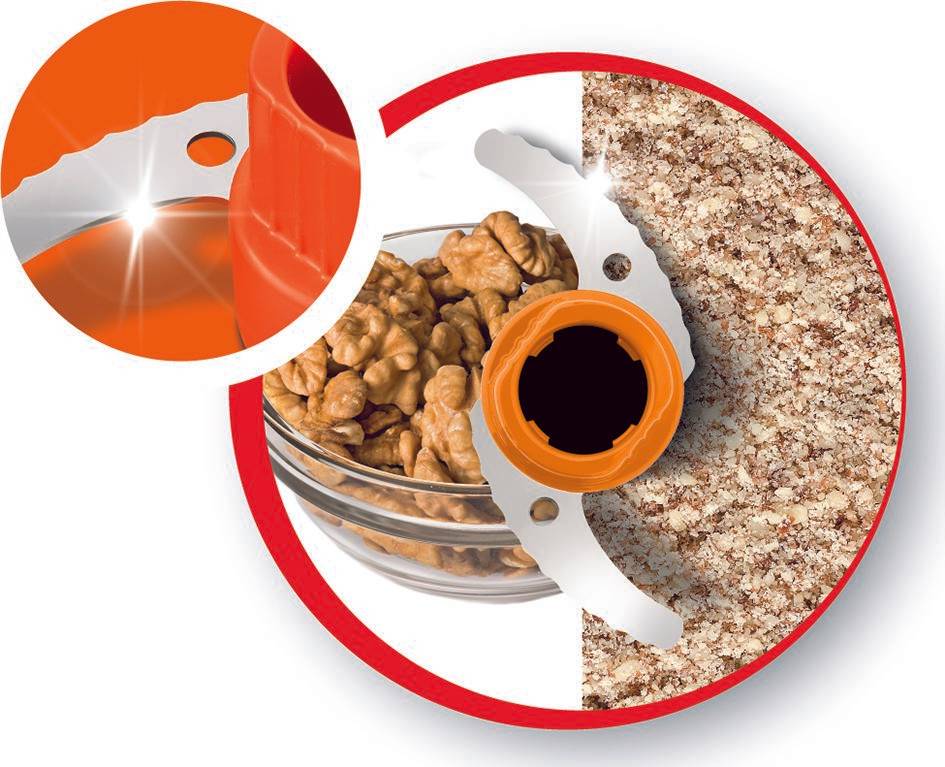 Grazie alle lame dedicate, bastano pochi secondi per ottenere i risultati desiderati: le lame affilate funzionano perfettamente su erbe aromatiche, verdure e carne; le lame seghettate, invece, associate al potente motore da 500W, garantiscono prestazioni elevate e durature sugli ingredienti duri, come il ghiaccio e i chicchi di caffè. Inoltre, l'accessorio salse consente di realizzare deliziose salse fatte in casa, come per esempio la maionese Il tritatutto Multi Moulinette è facile e comodo da usare grazie al semplice sistema di pressione e alla base antiscivolo 2-in-1, che funge anche da coperchio di protezione. Lavabile in lavastoviglie, questo apparecchio è facile da pulire grazie alle lame amovibili. Questo mini tritatutto compatto è facile da riporre: tutti i suoi accessori entrano nel contenitore e il cavo si avvolge nell'apposito spazio. Il tritatutto elettricoMulti Moulinette è prodotto in Francia ed è riparabile per 10 anni