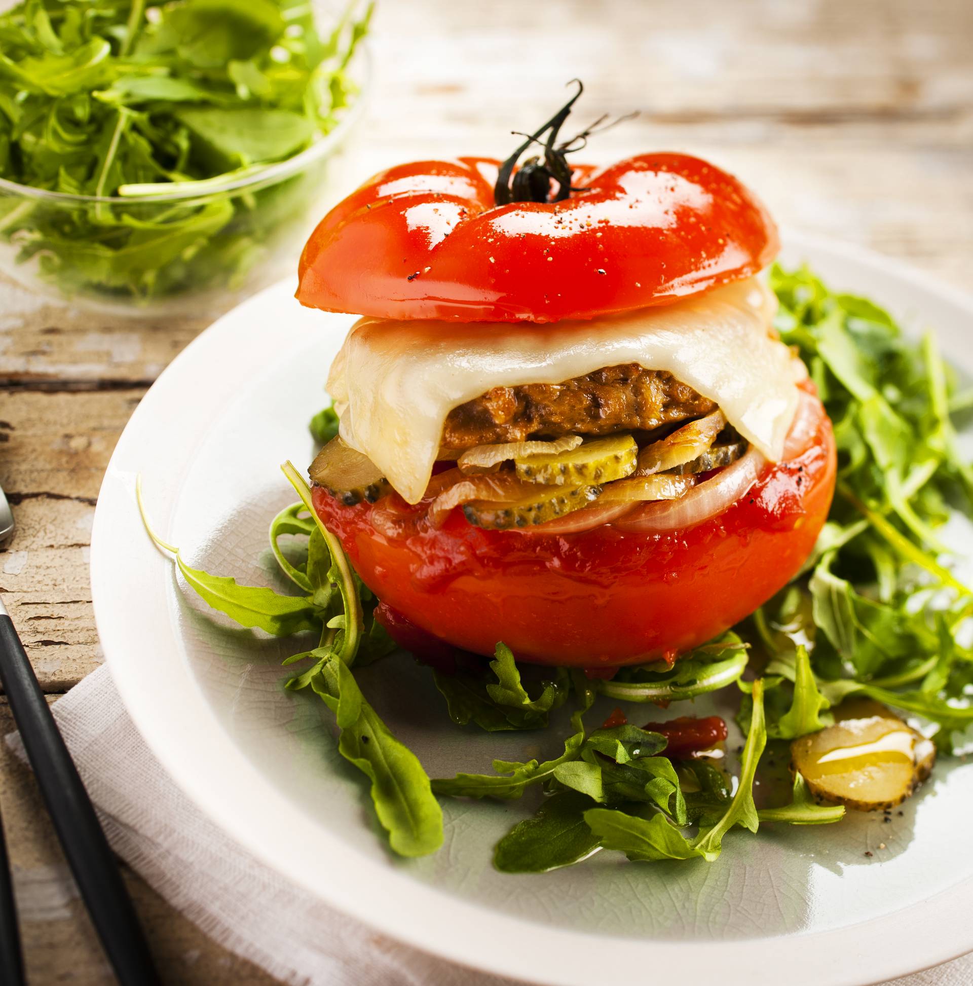 Saltare le cipolle nell'olio fino a imbiondirle. Formare: base di pomodoro, salsa, cipolla, sottaceto, bistecca, formaggio, pomodoro.