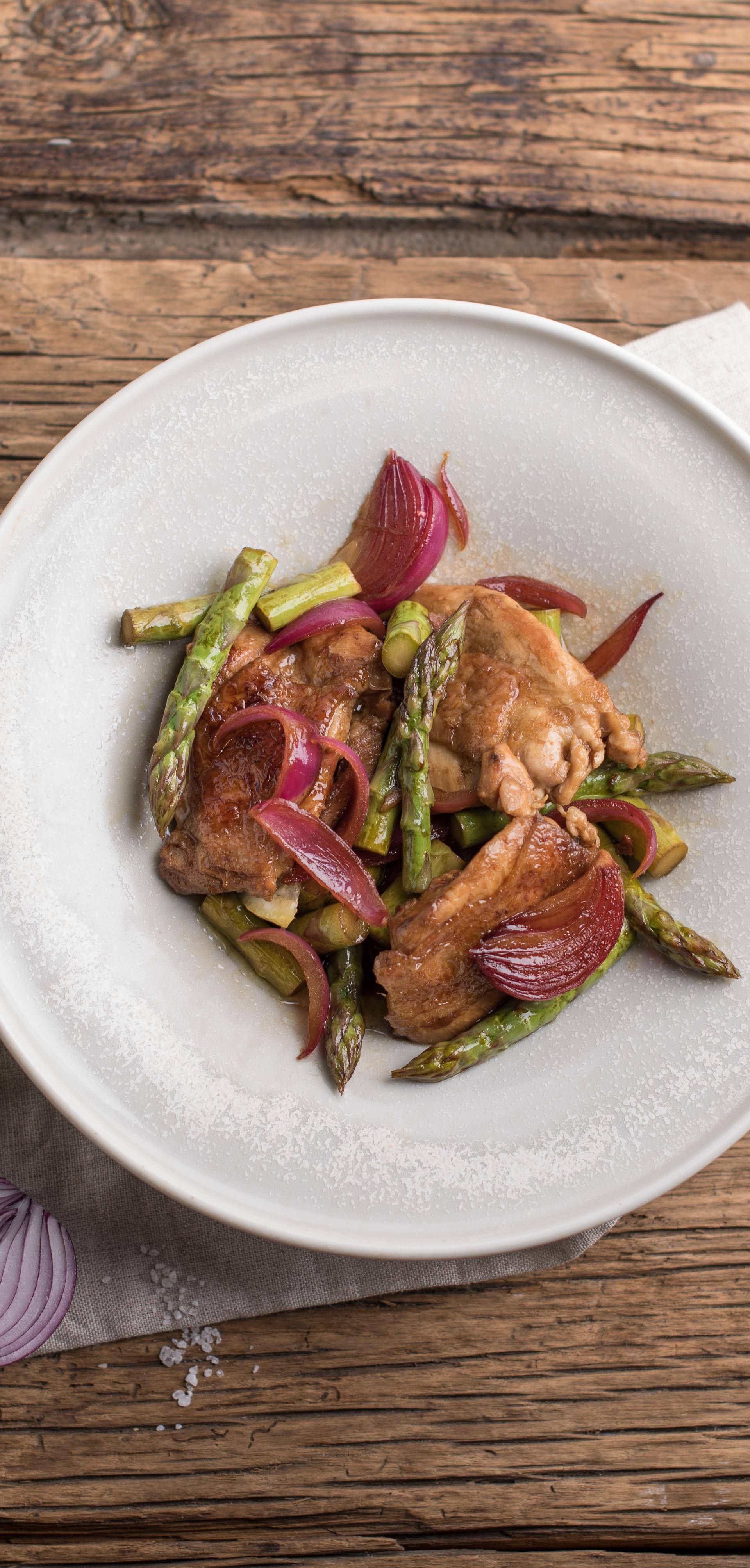 Aggiungere asparagi a losanghe, cipolla a rondelle, aceto balsamico