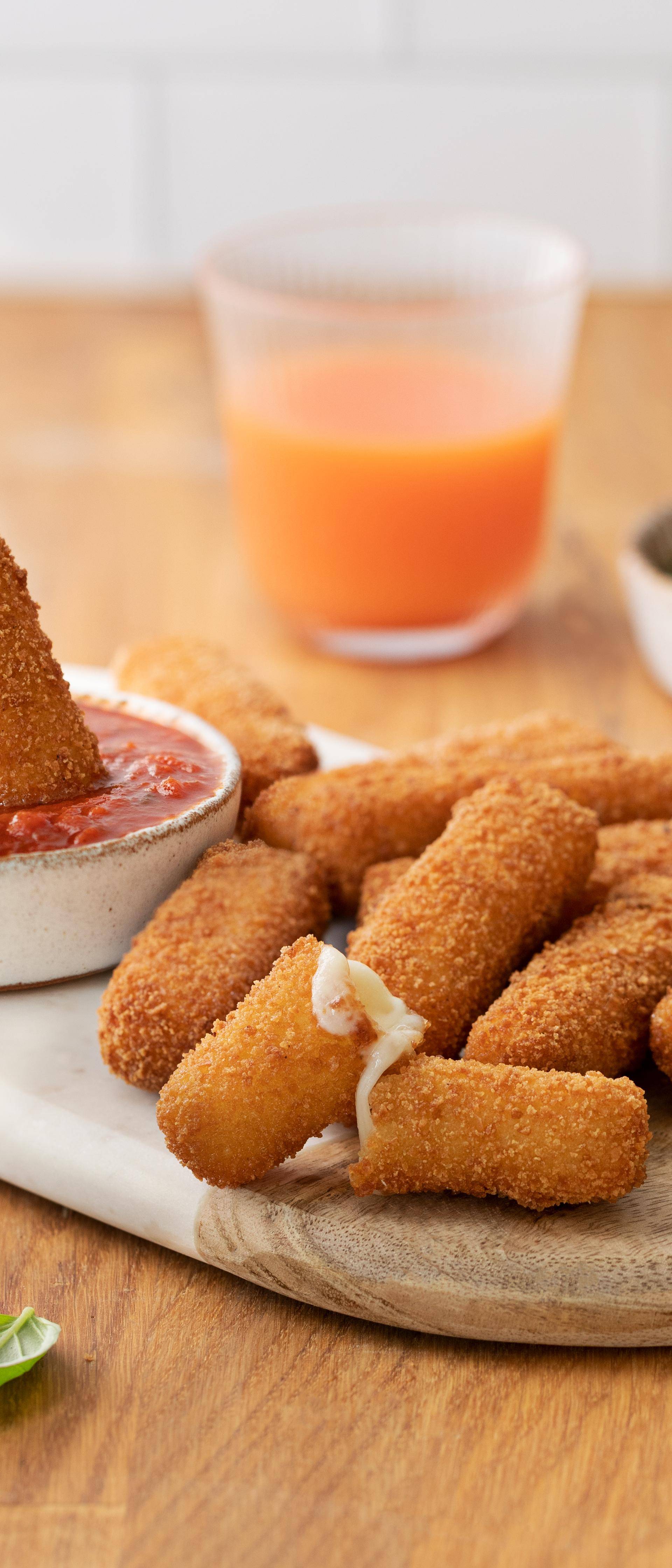 Coprire la griglia con carta da forno. Mettere metà dei bastoncini di mozzarella nel cestello di cottura, assicurandosi che non si tocchino. Spennellare con olio. Impostare il programma FRITTURA AD ARIA a 200°C per 13 minuti. Girarli con una forchetta a metà cottura. L’esterno deve essere croccante e dorato. Una volta terminato, ripetere il procedimento con la seconda porzione. Servire i bastoncini di mozzarella caldi.