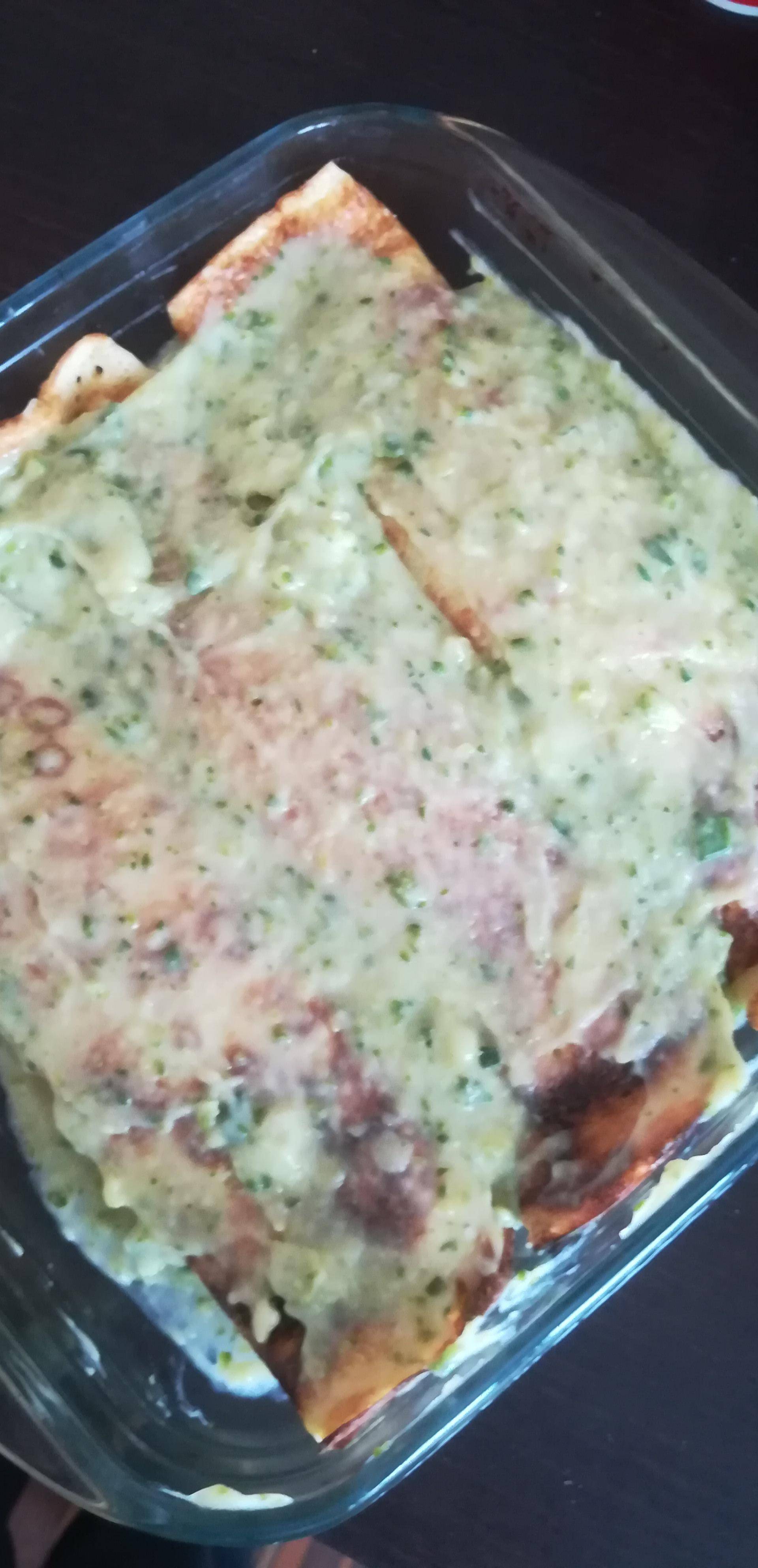 Prendere una padella per le crepes e, con la padella già calda, fare 5 crepes rotonde. In ogni crepes spalmare sopra il composto e arrotolarle. Mettere un po di composto alla base della teglia e adagiare le crespelle sopra. Poi coprirle con un leggero strato di composto. Infornare per 20 minuti a 180 gradi Servire caldo