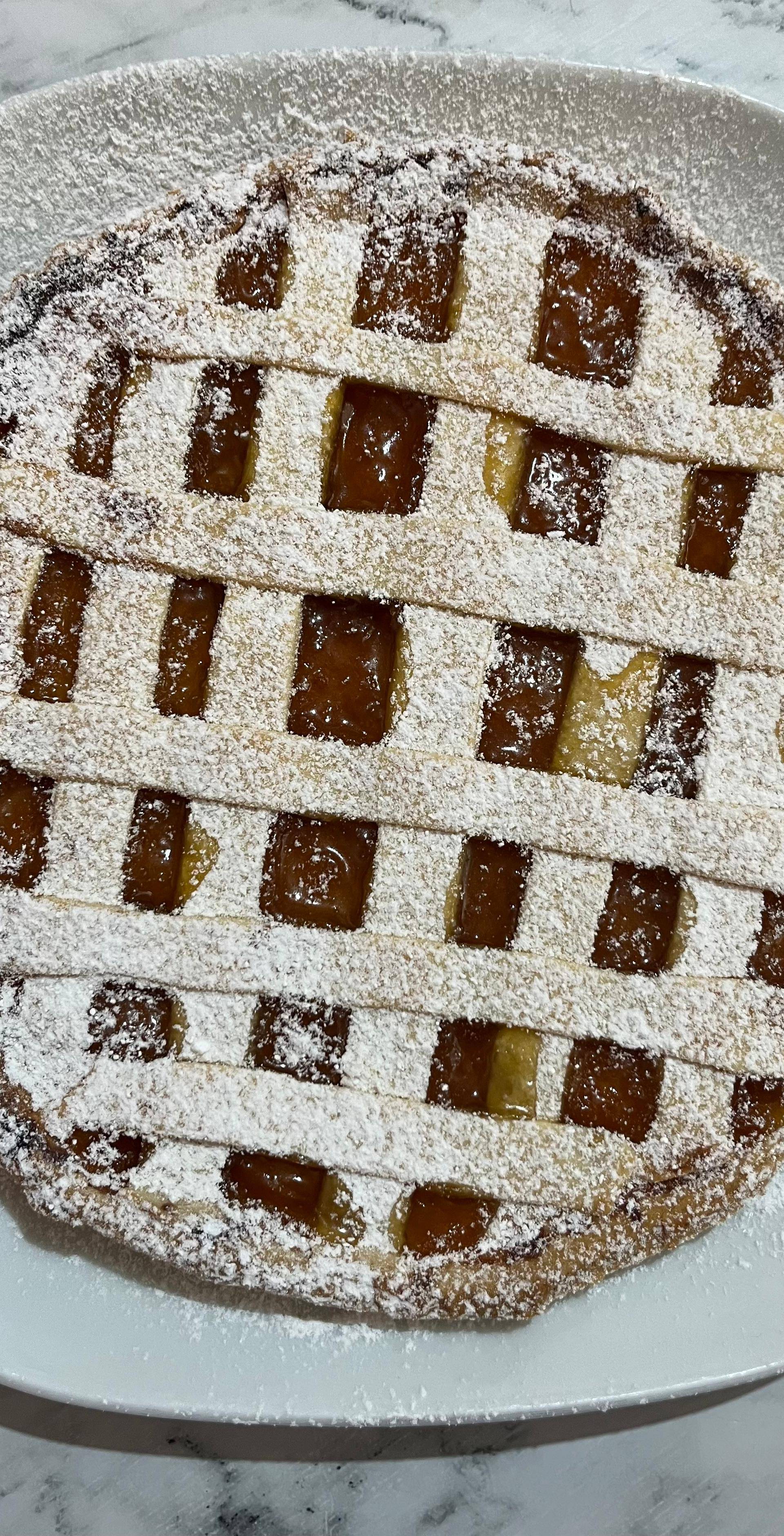 Tirare fuori dal forno, versare la marmellata sulla base e ricoprirla con strisce dell'impasto rimasto