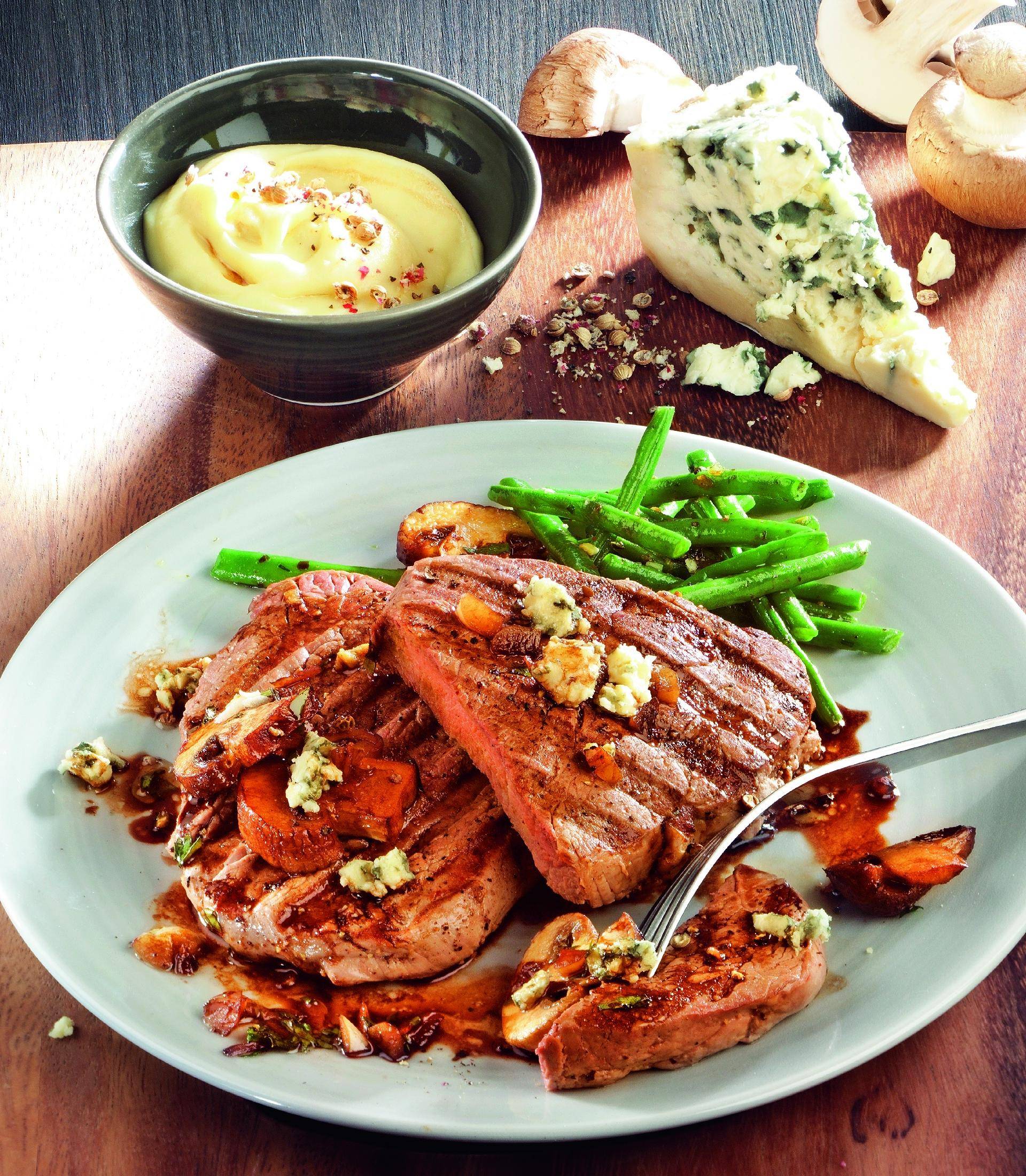 Una volta pronti i filetti di manzo, ricoprire con i funghi e servire. Infine, cospargere con pezzetti di formaggio erborinato.