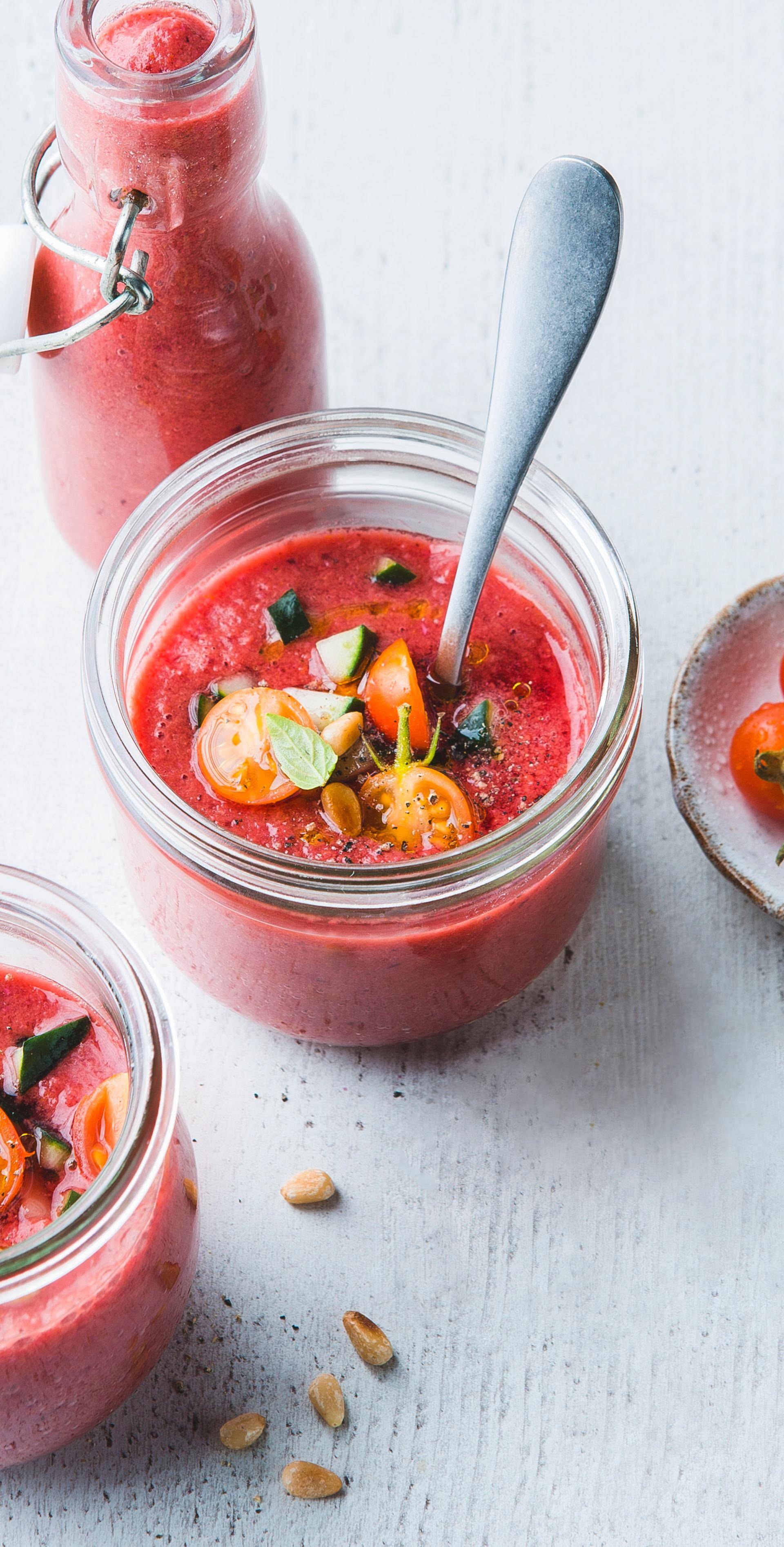 Inserire tutti gli ingredienti nell’apparecchio, iniziando dal pane secco. Tenere da parte i pomodori ciliegini e le foglie di basilico per la guarnizione. Avvitare le lame sulla bottiglia da viaggio e fissarla alla base. Frullare.