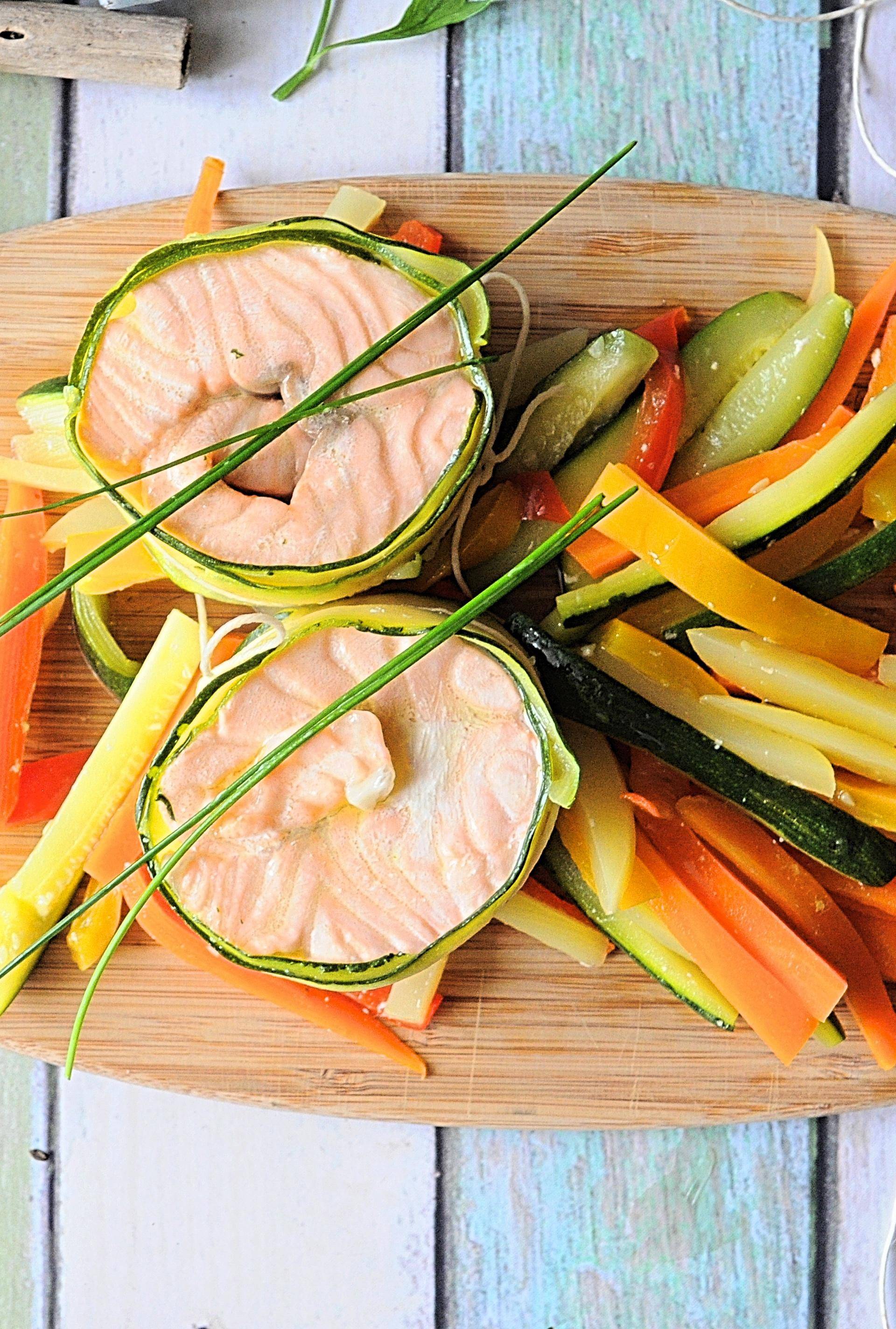 Ricavare dei nastri con le zucchine e rivestire i filetti di salmone