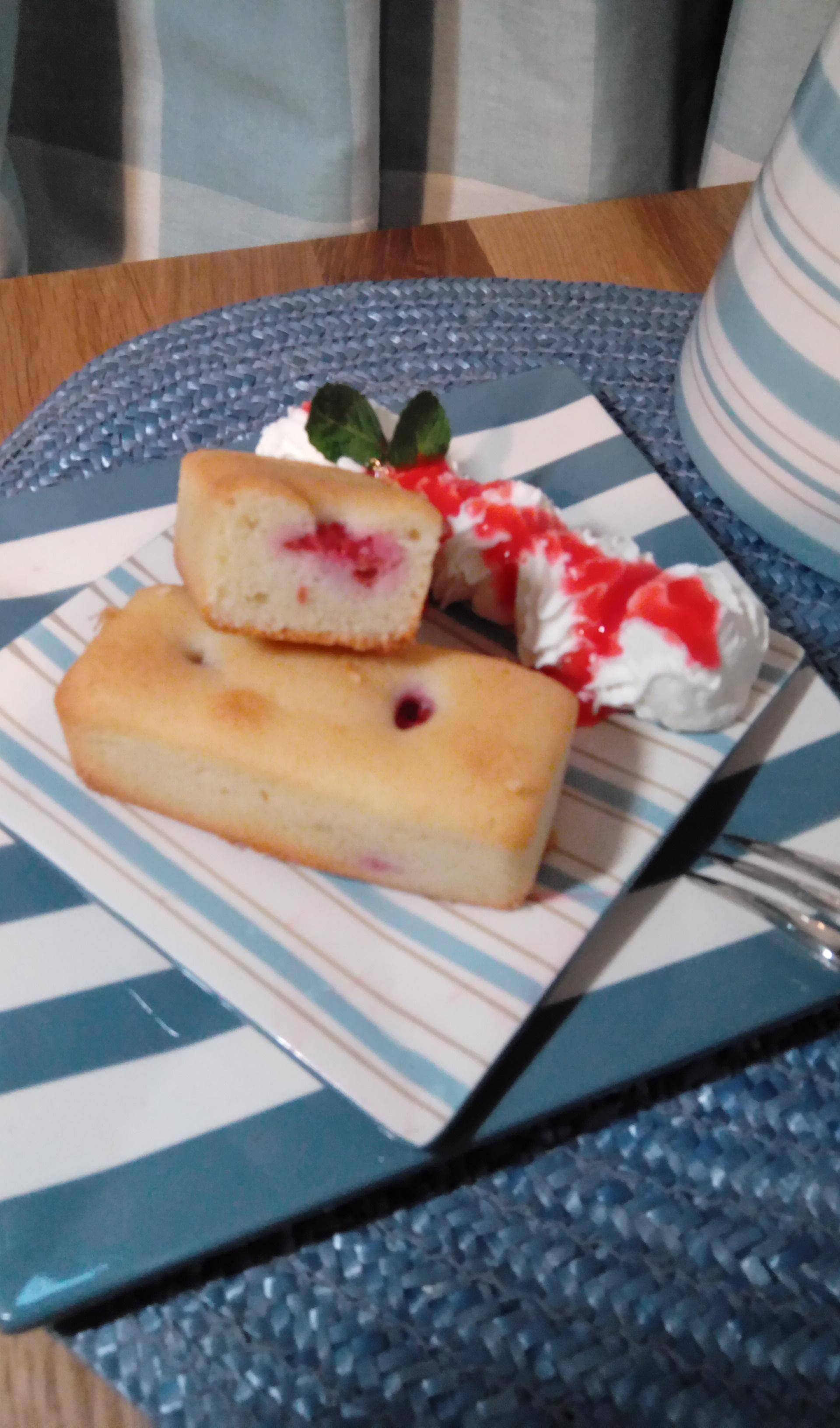 Versare il composto in uno stampo di silicone da 6 unità rettangolari tipo Proflex della Tefal ed inserire due lamponi per lingotto spingendoli bene verso il basso , cuocere in forno statico preriscaldato a 180 gradi per 25 minuti , ma fare sempre la prova stecchino
