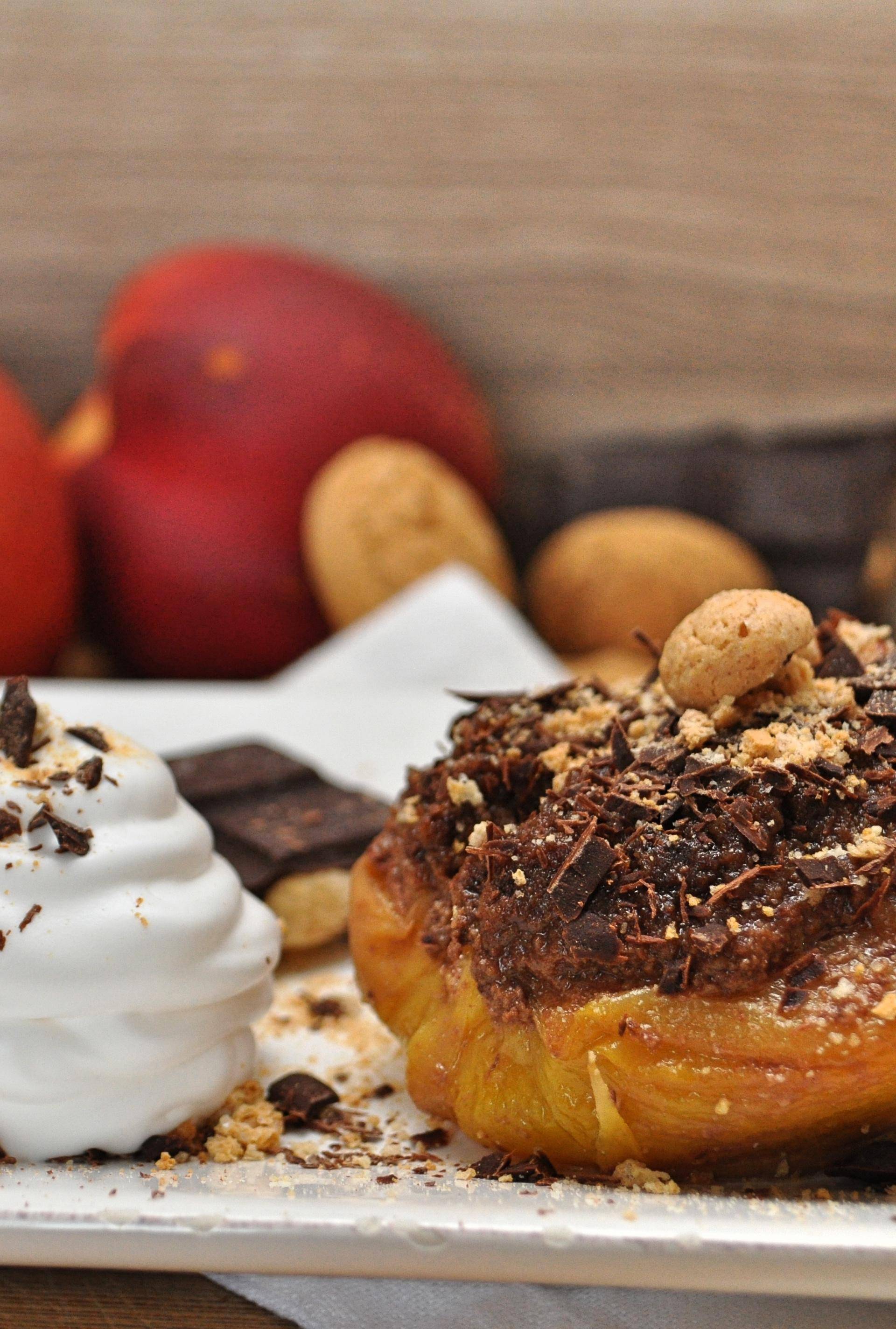 Tagliare le pesche a metà e scavare il centro. Frullare la polpa, gli amaretti lo zucchero il cioccolato il burro i tuorli e il vino