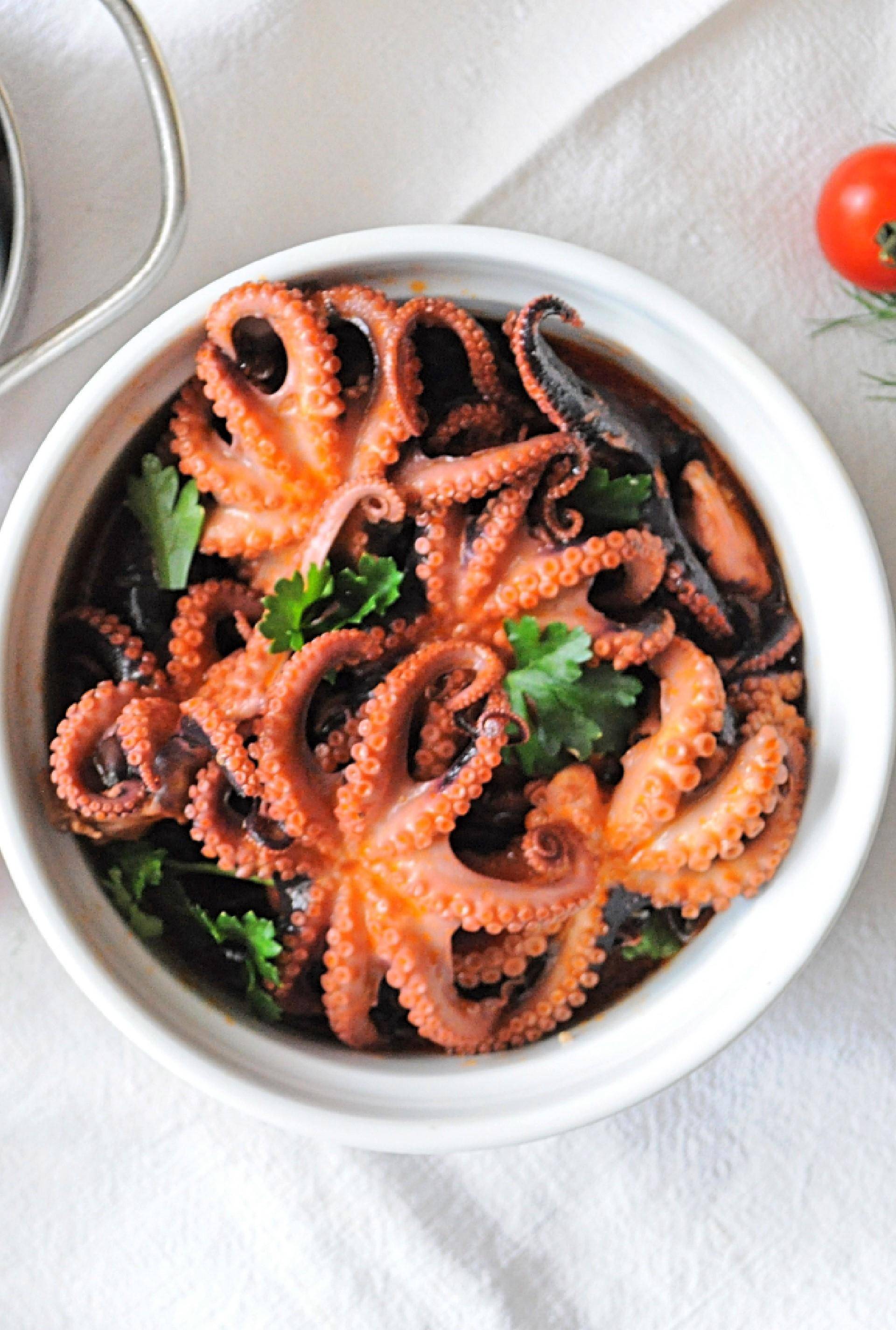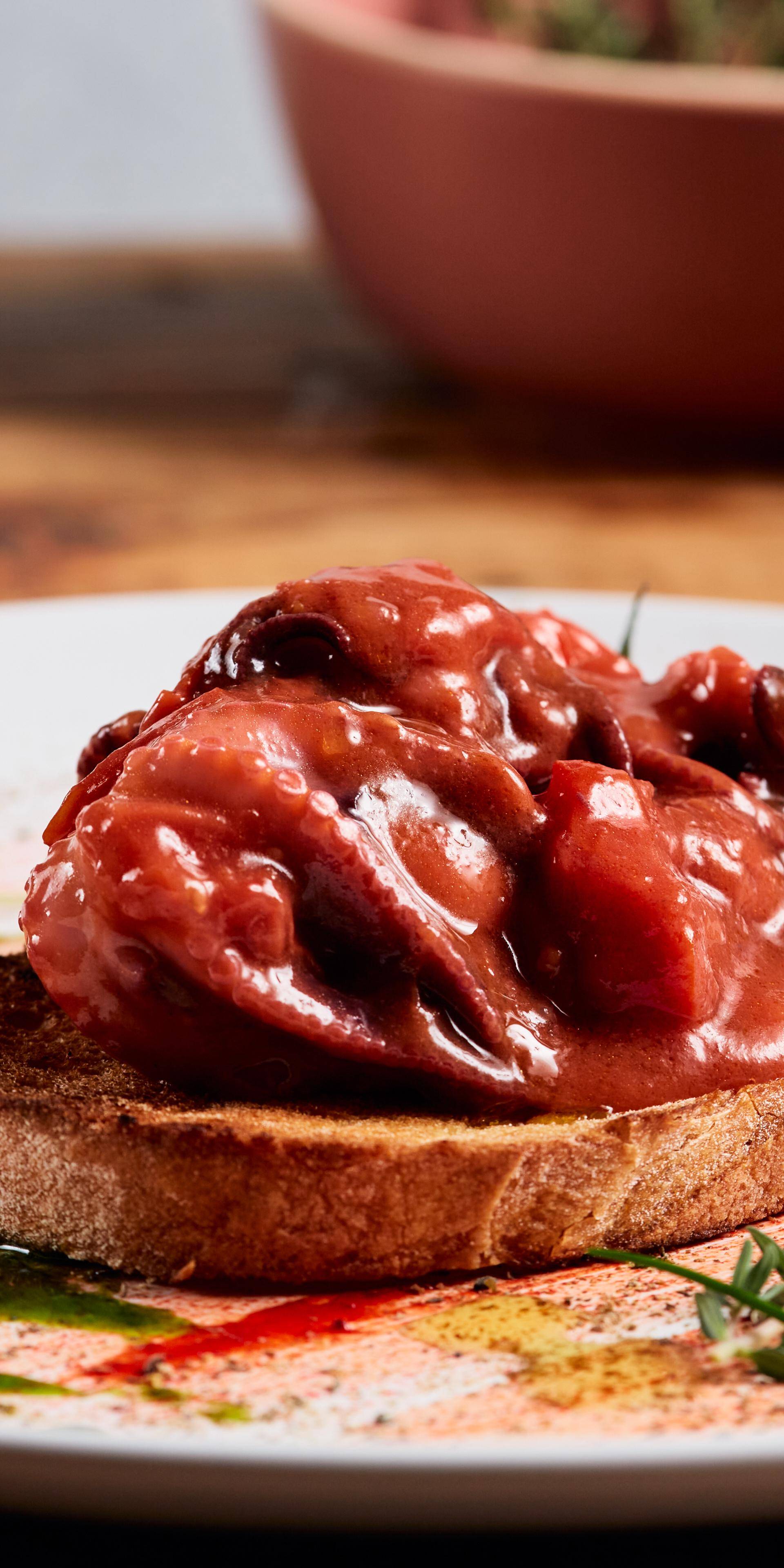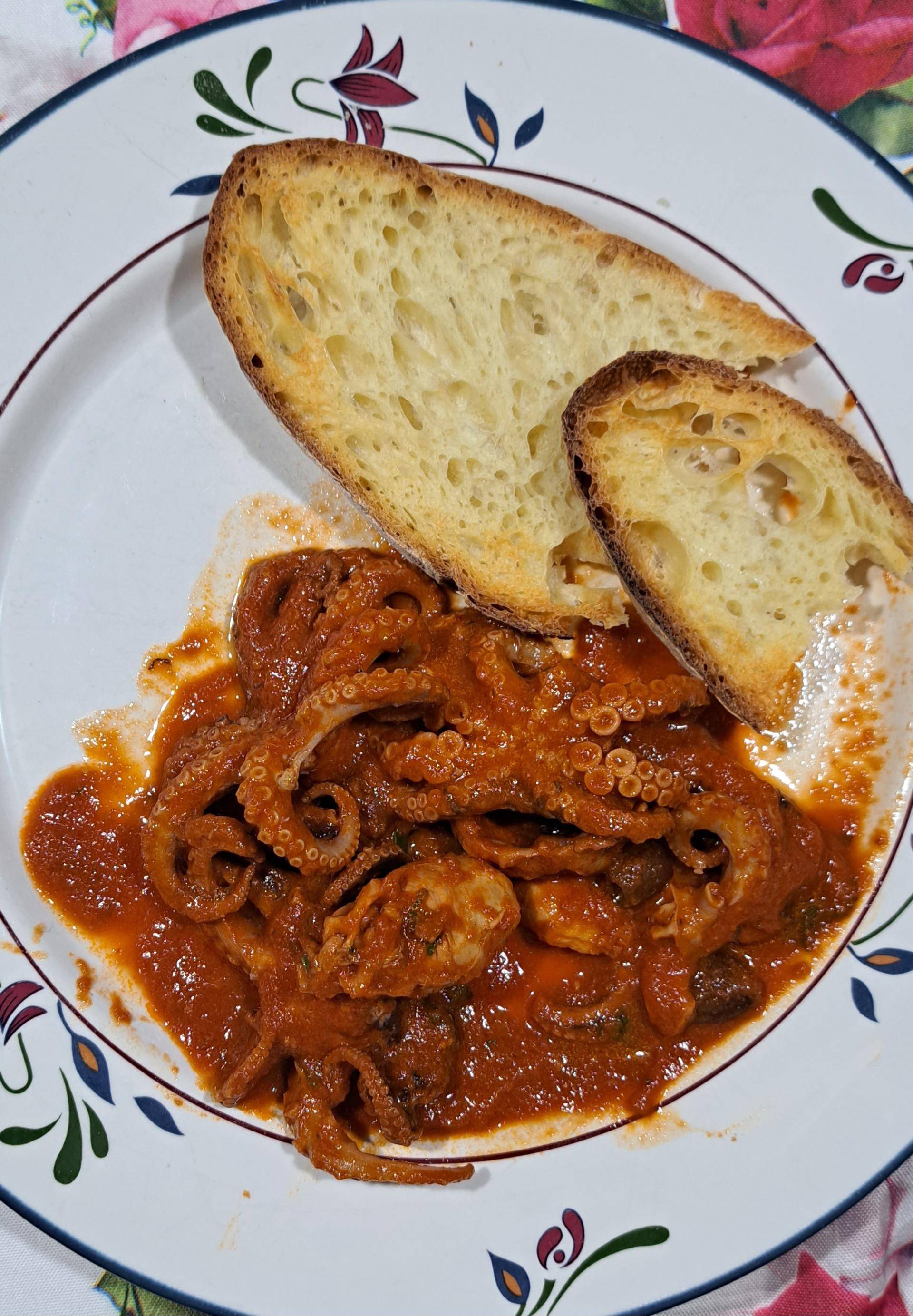 Polpo alla Luciana in umido rosso e pane bruschettato alla griglia