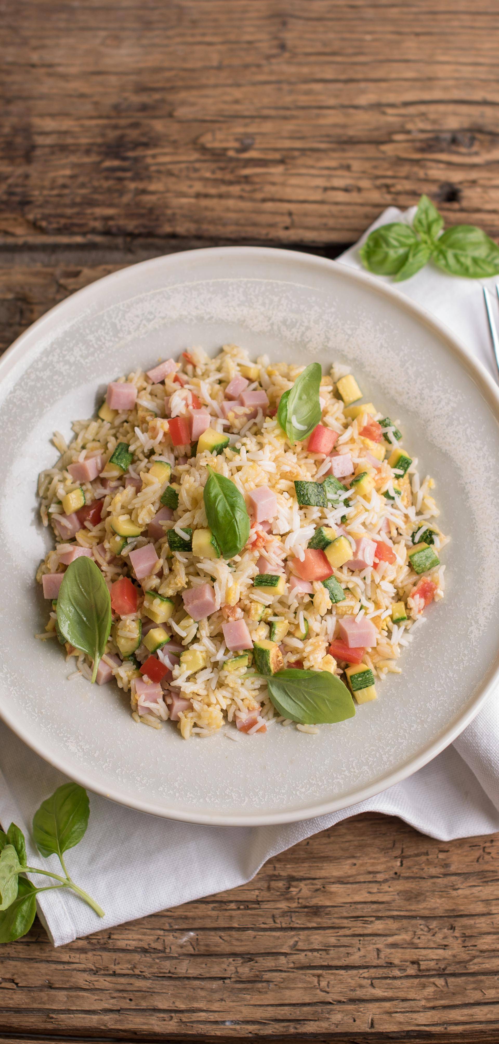 Inserire le zucchine a cubetto, il prosciutto a cubetto, i pomodori a pezzi ed il basilico