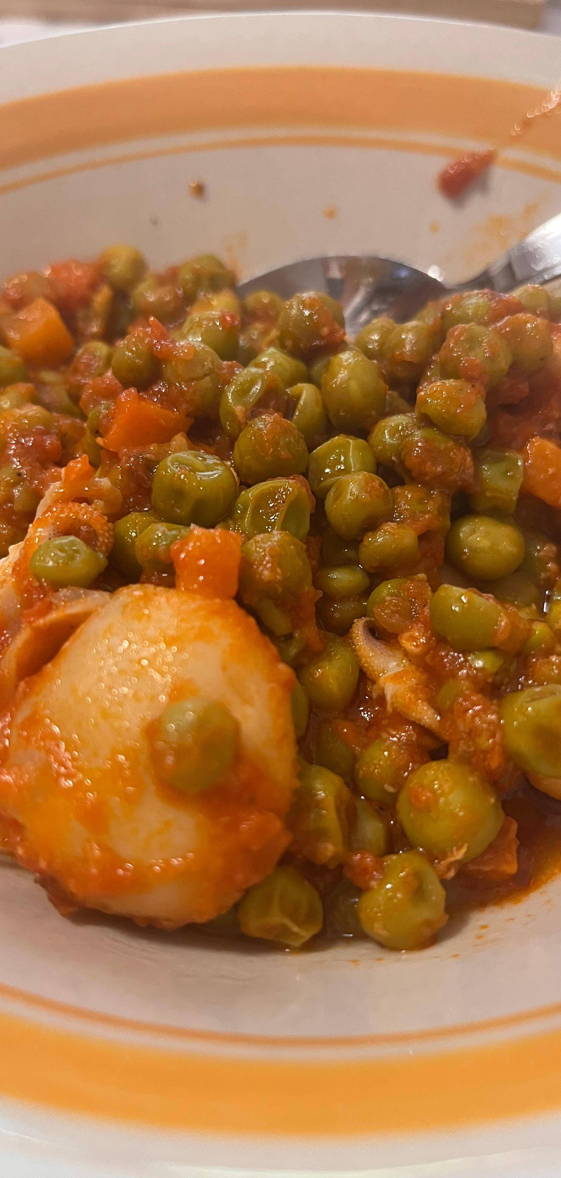 Aggiungere i Piselli, mescolare e aggiungere la passata di pomodoro diluita con un po’ d’acqua